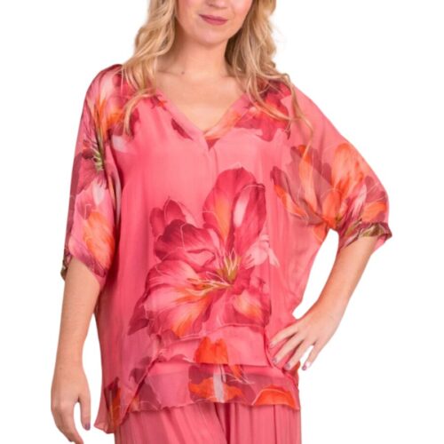 Silk Floral Bloom Print Kaftan Blouse – Coral