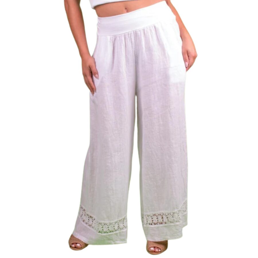 Comfortable Jean Style Cropped Pant with Stretchy Waistband. Available in Two Sizes. Two Front Pockets and Two Back Pockets. Features a Black & White Floral Design with Gold Detail.